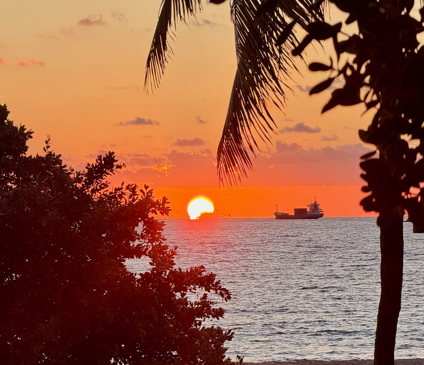 I will still toggle between north and south, but having landed in the state of sunshine and palm trees, I am looking forward to this change of latitude. I am now watching the sun rise on the terrace of a restaurant that doesn’t open till dinner, looking out over cars on the road and a beach just beyond with freighters on the horizon. The geese haven’t gotten this far south yet. I don’t know if they ever arrive in Florida. I will find out. There are occasional sea gulls. I will miss the geese and ducks but will see them again in the spring and summer when we both return, and meanwhile starting next year, I will vote again, perhaps with more consequence.