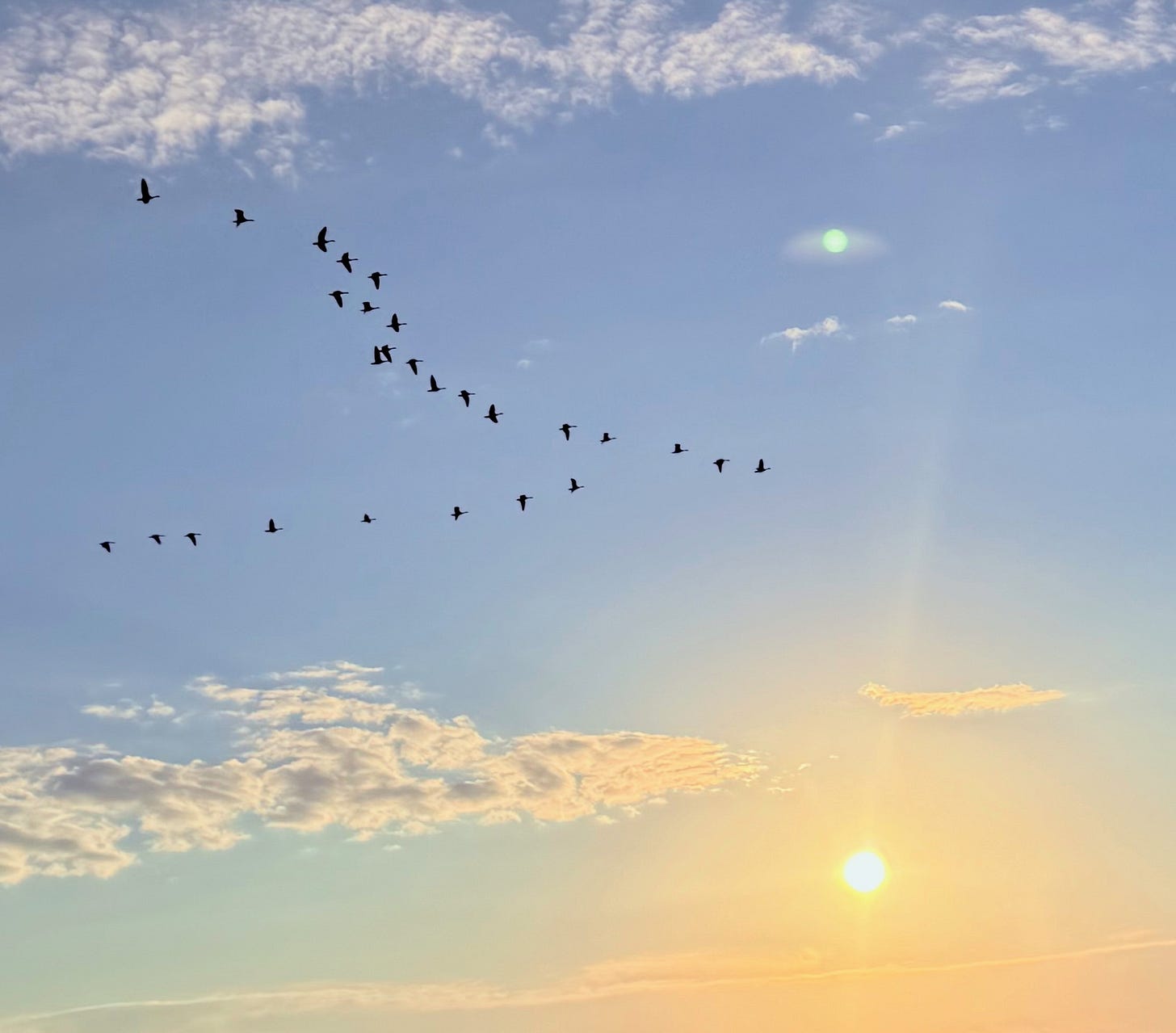 Geese are starting to fly South, squawking over the river in formation. At least I think theirs is a southward journey. It might just be a Saturday morning field trip, but I haven’t seen any flying in the opposite direction. It is not yet winter, and as I sit by the river this morning facing east with the rising sun in my face, I am pleasantly warm in only a bulky sweatshirt and pants but am told by the weather forecasters that an arctic wind is on its way. The geese are honking all around the river so I think they already know it is time to hit the road or the air.